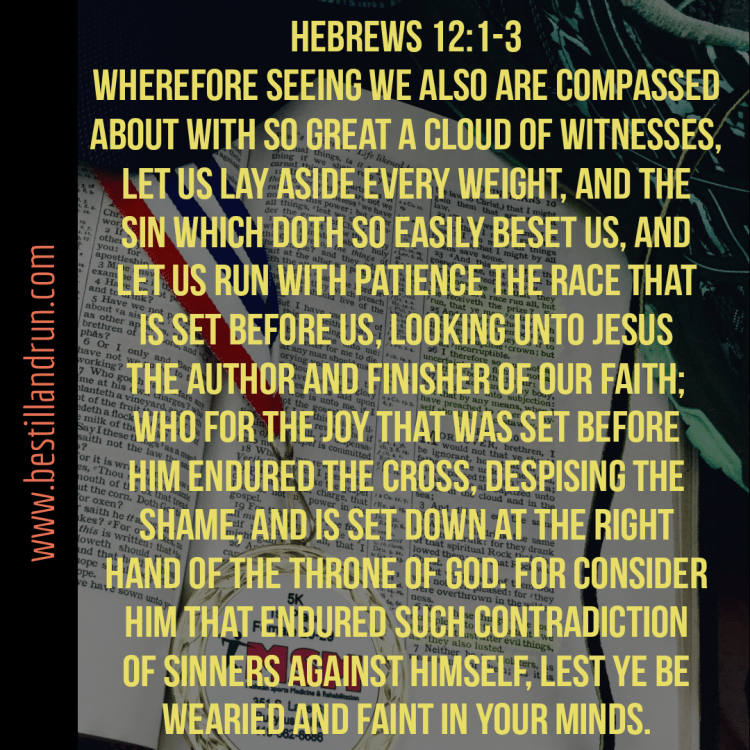 “Wherefore seeing we also are compassed about with so great a cloud of witnesses, let us lay aside every weight, and the sin which doth so easily beset us, and let us run with patience the race that is set before us. Looking unto Jesus the author and finisher of our faith; who for the joy that was set before Him endured the cross, despising the shame, and is set down at the right hand of the throne of God. For consider Him that endured such contradiction of sinners against Himself, lest ye be wearied and faint in your minds.”