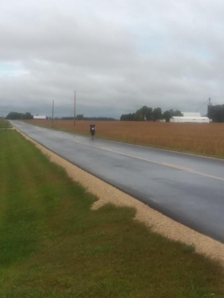 Immediately pulling out of the park I found someone directly in front of me going a good pace so I decided to stay behind her for the first mile as I continued my warm up. The second mile I ended up breaking away to set out on my own steady pace since luckily today’s warm up was a short one – must have been all the adrenaline. I started out with a rain jacket but quickly switched to a garbage bag as it got hot pretty quickly.
