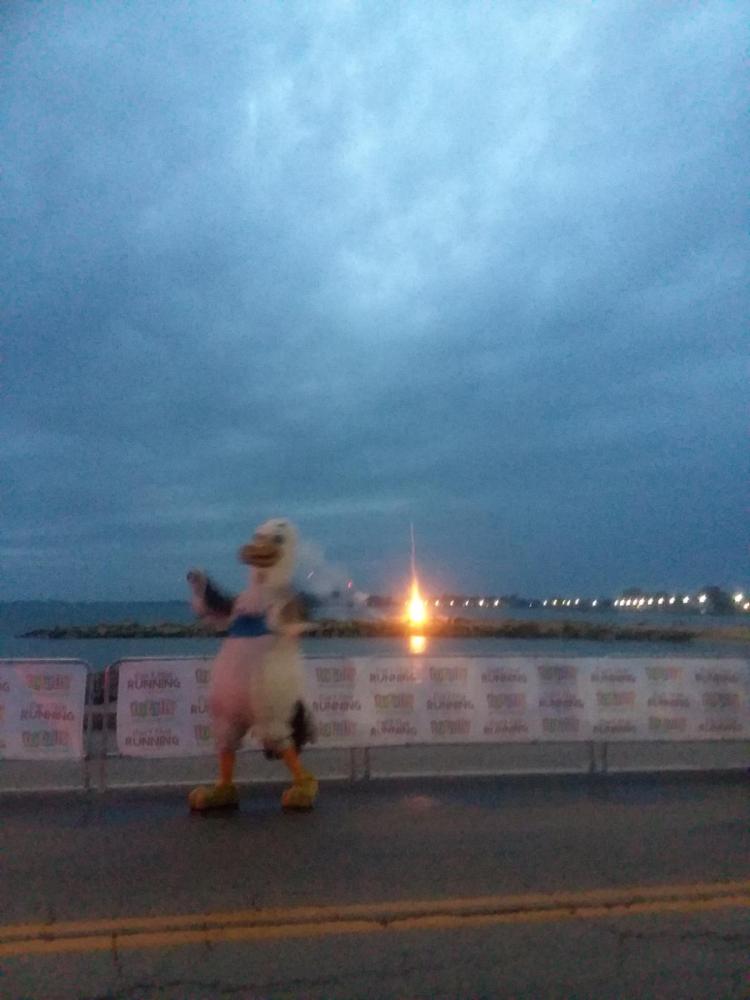 Everyone got in line as they sang the National Anthem and then the fireworks that started the race were awesome. As we all ran over the start line there was a guy dressed up as a duck which made me laugh as I high fived him. My goal during this marathon was to laugh and smile as much as I possibly could so that I would stay loose and light hearted. I was off to a good start!
