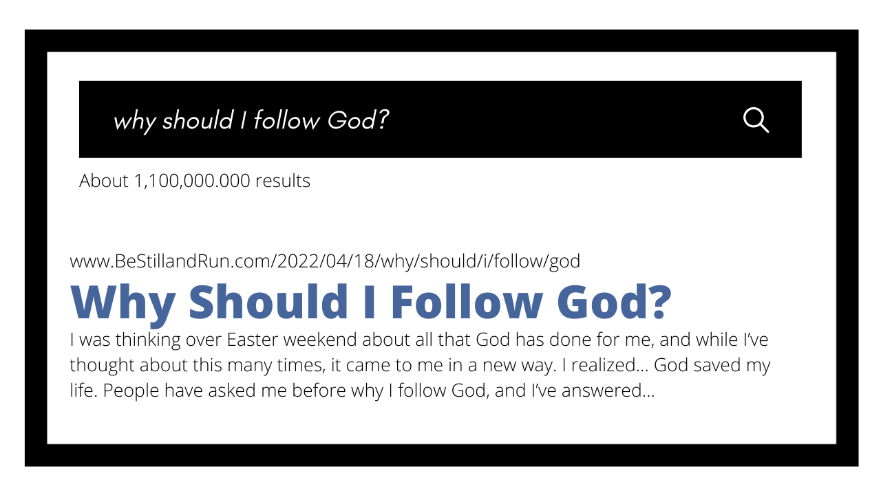 In the time of writing this I wanted to come up with a good title and when I googled, “Why I Should Follow God?” I was shocked with how many results it came up with – 1, 100, 000, 000. That’s a lot of numbers and a lot of reasons why we should follow Him!