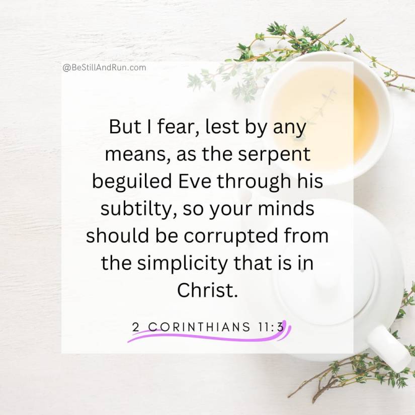 But I fear, lest by any means, as the serpent beguiled Eve through his subtilty, so your minds should be corrupted from the simplicity that is in Christ.