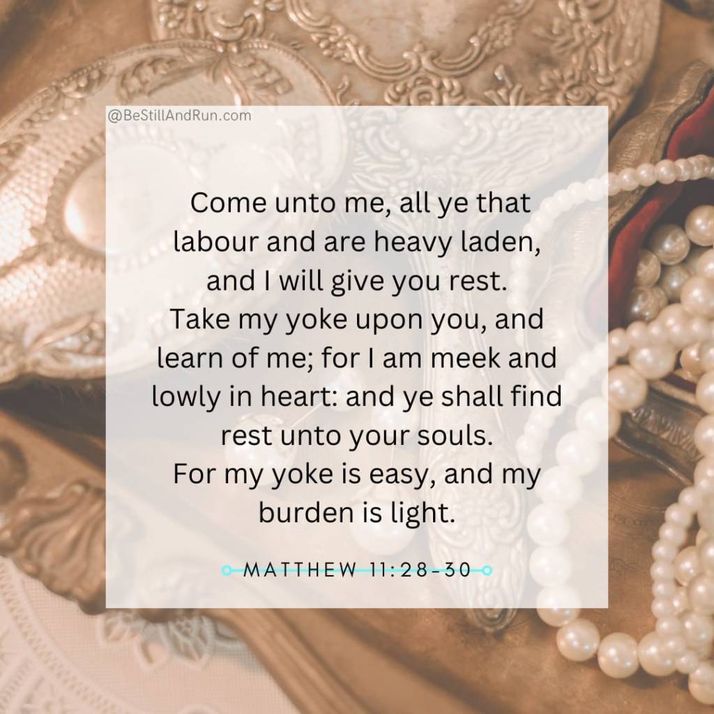 Come unto me, all ye that labour and are heavy laden, and I will give you rest. Take my yoke upon you, and learn of me; for I am meek and lowly in heart: and ye shall find rest unto your souls. For my yoke is easy, and my burden is light.
